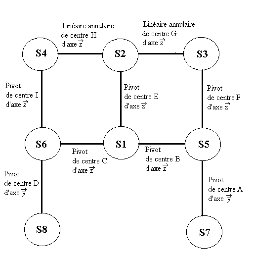 Nous avons associé entre elles les pièces qui sont en liaison encastrement. En suite, en utilisant la représentation normalisée et en respectant les orientations des liaisons, nous avons réalisé une représentation schématique des liaisons: le schéma cinématique