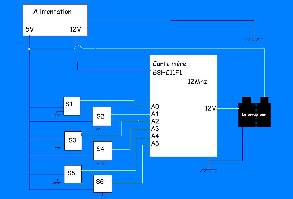 LLes servos-moteurs sont alimentés en 5V pour un fonctionnement optimal, et la carte mère 68HC11F1 de 12MHz en 12V.