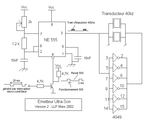 Le schéma électrique de la plaque émettrice vous est présenté ci-dessus. Celui-ci est très simple. On retrouve un amplificateur intégré de référence NE 555. Ce circuit intégré NE 555 est monté en astable et permet de générer des trains d'impulsions de 40kHz qui attaquent les transducteurs à ultra-son . Ainsi, à chaque fois que le PC envoie des impulsions via la broche D du port parallèle sur l'entrée de commande du 555, on obtient en sortie des trains d'impulsions de 40khz |