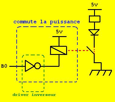 3/ Les LED (ou DEL): Les lumières sont reliées sur les sorties R0 et R1 du control Boy. Ces sorties relais sont liées aux sorties B0 et B1 du µc. Pour activer les LED le µc envoi une information de niveau 1 sur les sorties B0 et B1, ce qui entraîne la fermeture du relais R0 ou R1, donc qui permet l'éclairage de la LED. BO est relié à un driver inverseur qui permet de faire passer le "0" appliquer à B0 à "1" et vis versa...