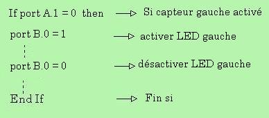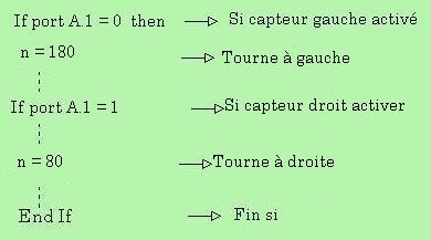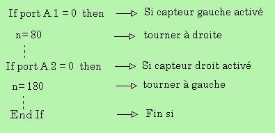 4/ Bloc capteur: Les capteurs sont reliés sur les entrées A1 et A2 du µc. Lorsqu'il y a présence d'un obstacle, le capteur est activé et passe au niveau 0. L'entrée A1 ou A2 passe au niveau 0 ce qui entraîne l'arrêt du robot, puis le robot se met à reculer et à tourner vers la droite ou vers la gauche, cela dépend du capteur qui est activé.