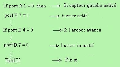 6/ Le Buzzer: Le Buzzer est relié sur le relais R7 du µc qui est contrôlé par le port B7 du microcontrôleur X68C75. Lorsqu'il y a détection d'un obstacle par l'un des deux capteurs, le port B7 passe au niveau 1 et permet au buzzer de sonner lorsque le robot détecte un obstacle et lorsqu'il recule.