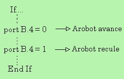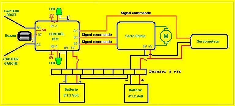 déterminer, au mieux d'éviter les obstacles qui lui sont contraints. A/ But de la programmation: Le robot doit être capable d'avancer tout en évitant les obstacles détectés par ses capteurs positionnés à l'avant de l'Arobot. Si le capteur droit est déclenché alors le robot s'arrête et tourne à gauche tout en reculant puis s'arrête à nouveau et reprend sa marche avant avec une direction rectiligne, et vis versa pour le capteur de gauche. Pour comprendre l'écriture d'une programmation voici l'exemple d'une syntaxe qui nous sera nécessaire: PORT B.0 = 1 Le "0" est le numéro de la sortie du port B et "1" est le niveau logique appliqué (correspondant à 5v en sortie) B/ Le Buzzer et les DEL: Le buzzer est une sorte d'alarme déclarant, dans le cas de ce robot, la détection d'un obstacle et la mise en route de sa marche arrière. De même pour la DEL qui s'allume selon le capteur actif. C/ Explications, schématisations et programmations des différents composant de l'Arobot: 1/ Le control-Boy 3 C'est une mini carte mère d'ordinateur capable de programmer à l'aide d'une puce EEPROM qui permet de créer ou supprimer des programmes par le biais d'un ordinateur (électricité). Le control-Boy 3 possède des entrées et des sorties destinées aux tensions, aux relais, capteurs...Pour simplifier on appellera le control-Boy 3: "microcontrôleur" (µc).