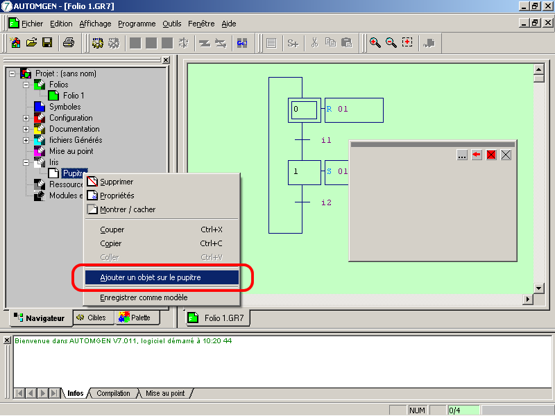 Nous allons maintenant ajouter les 2 boutons sur le pupitre. Pour ajouter un éléments au pupitre, il faut cliquer droit sur Pupitre (dans l'arborescence à gauche de l'écran) puis cliquer sur Ajouter un objet sur le pupitre :