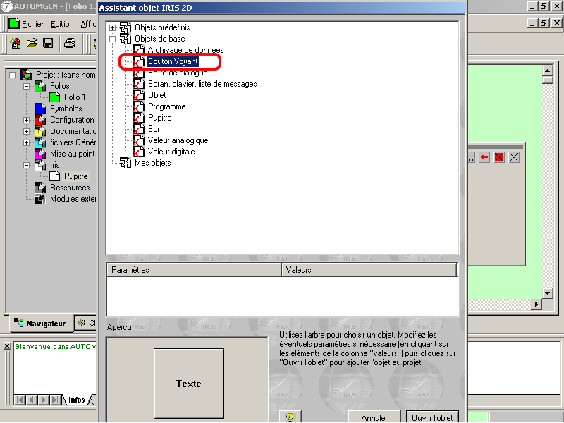 Choisissez l'objet Bouton Voyant dans la liste des Objets de base puis valider en cliquant sur Ouvrir l'objet :