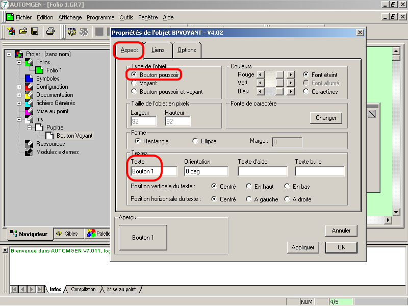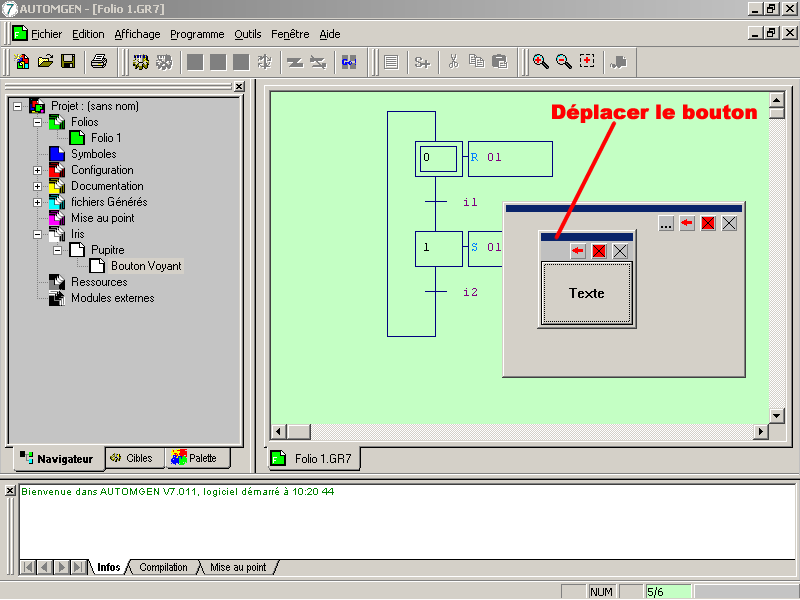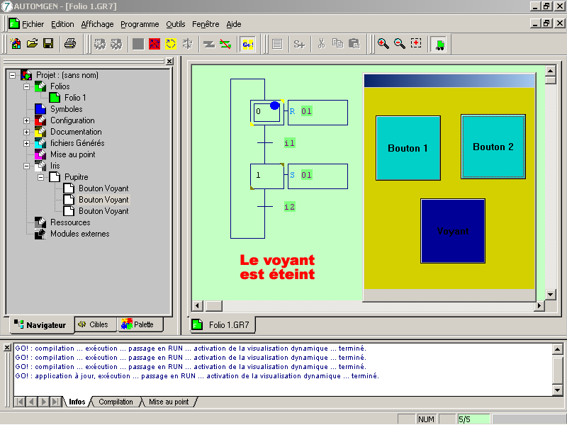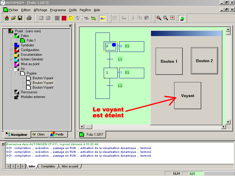 Nous venons de voir comment faire en sorte que des boutons poussoir placés sur le pupitre agissent directement sur les entrées i1 et i2 de l'automate. Voyons maintenant comment placer sur le pupitre un voyant, qui sera allumé ou éteind selon que la sortie O1 et l'automate est à 1 ou à 0.
