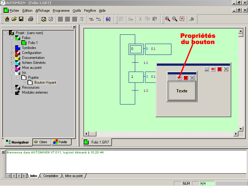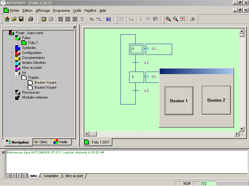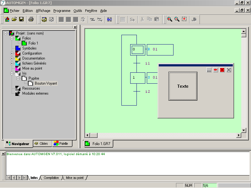 Nous allons voir dans ce document ressource comment créer sur mesure un pupitre sous Automgen, contenant des boutons et des voyants, et comment connecter les boutons aux entrées de l'automate (i0, i1, i2, i3, etc.) et les voyants aux sorties de l'automate (O0, O1, O2, O3, etc.).