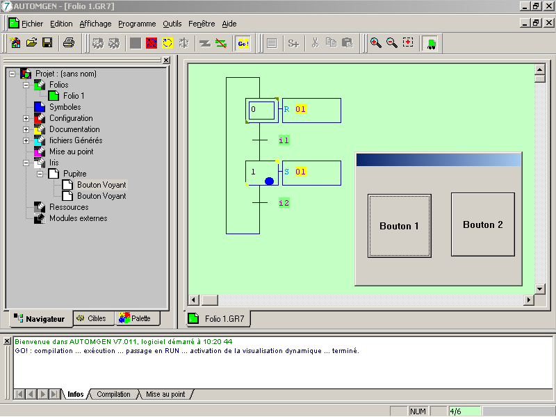 Si on appuie sur le Bouton 1, l'entrée i1 est activée et le grafcet passe alors à l'étape 1 : la conséquence est que la sortie O1 est mise à 1 :