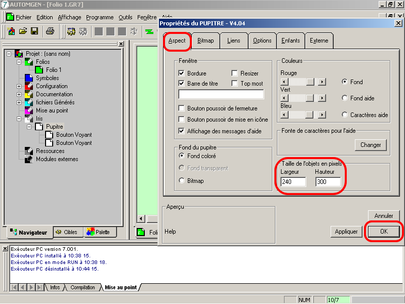 Mais avant d'ajouter le voyant nous allons agrandir le pupitre en réglant sa taille dans l'onglet Aspect de sa boite Propriétés :