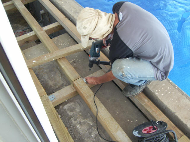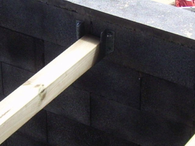 Je place mes poutrelles régulièrement tout autour de la piscine. Les poutrelles sont vissées sur des sabots qui sont fixés avec des tire-fonds dans les murs (piscine et maison). Pour la hauteur, il suffit de faire une addition : L'épaisseur de la poutrelle fait 90mm, les traverses 90mm et le caillebotis 36mm : il faut donc positionner les sabots à 216 mm (21,6cm) du niveau de la piscine.
