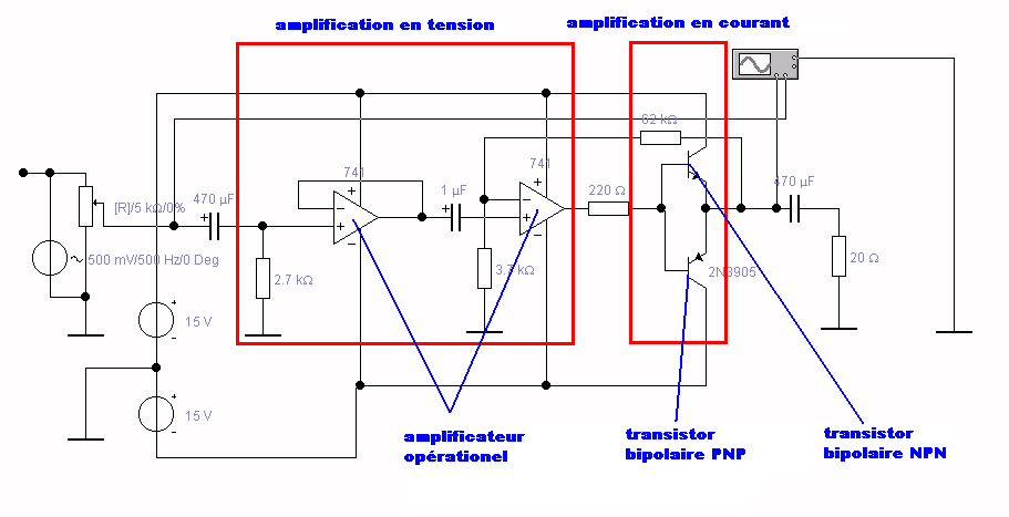 -la seconde étape a, quant à elle, pour but d'amplifier en courant le signal préalablement amplifié en tension. En effet si le signal n'était pas amplifié en courant, il y aurait atténuation du signal dés la mise en place d'une charge (haut-parleur). Cette fonction est donc assurée par deux transistors bipolaires NPN et PNP montés en mode "push-pull".