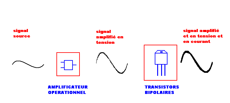 la fonction "amplification", quant à elle, sera réalisée en deux sous étapes. En effet l’amplificateur audio est dénomminé par « amplificateur audio de puissance », il faut comprendre par « puissance » l’amplification tant en tension qu’en courant, étant donné que la puissance est le produit de la tension par le courant.