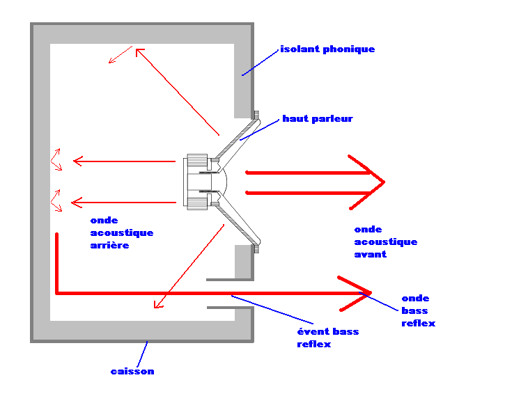 Une caisse de résonance (aussi appelé caisson) est le boîtier dans lequel loge le haut-parleur. Si l’on considère un sub-woofer utilisé en free-air ou en charge infinie (sans caisson, dans un caisson perméable..), en corrélat avec ce qui sera démontré dans la partie d, on aura des ondes sonores se dirigeant dans tous les sens, et, étant donné que les ondes « arrières et avants » (venants soit de l’arrière ou de l’avant de la membrane) ont un déphasage d’une demie période, un phénomène acoustique appelé court-circuit acoustique se produit. Ce phénomène se traduit en fait par l’addition de deux ondes déphasés d’une demie période, ce qui donnera comme résultante une nulle (son atténué quasiment atténué dans son entièreté). Pour empêcher ce phénomène de se produire on utilise un caisson qui va « traiter » l’onde arrière. Dès lors plusieurs technologies s’offrent à nous dont les deux plus utilisées sont le « caisson clos » et le « caisson Bass Reflex ».