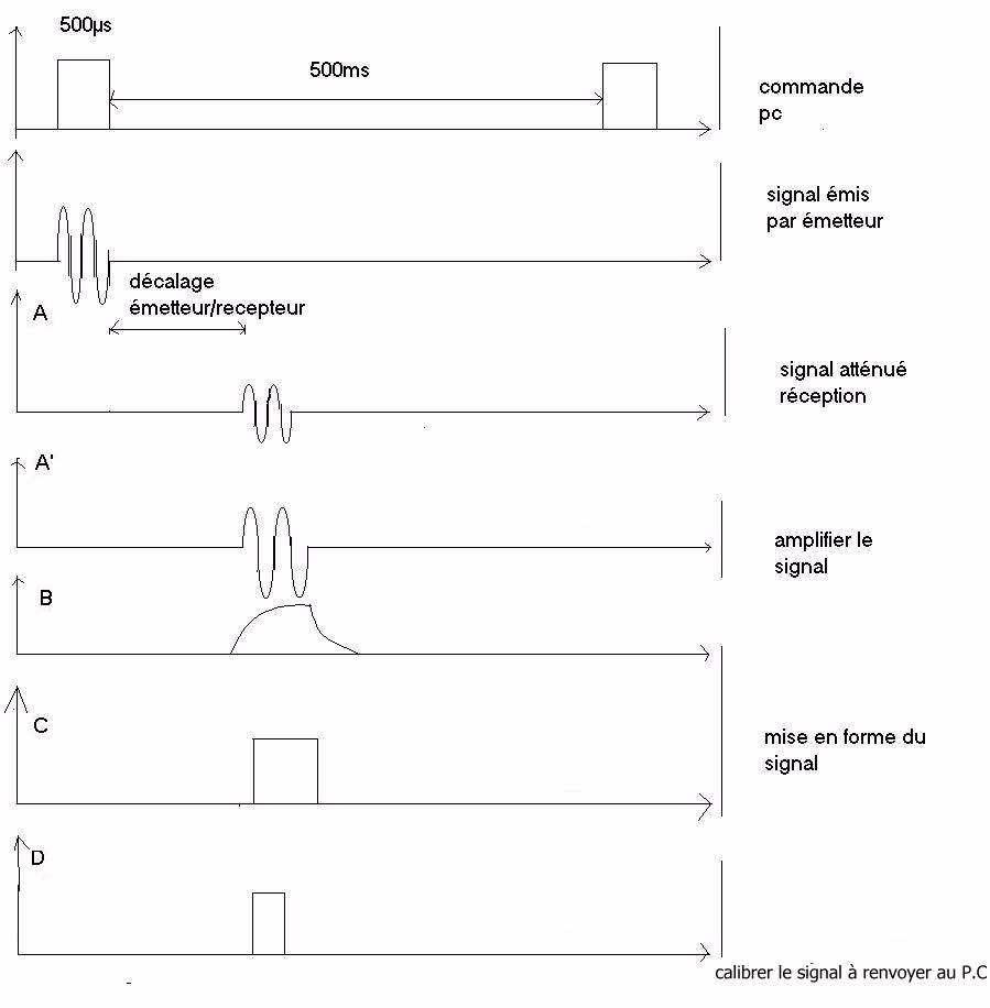 le principe est simple, le PC ordonne à l'émetteur d'émettre un signal et puis le signal est reçu par le récepteur qui va le mettre en forme et le calibrer. le programme que nous avons effectué nous permet donc de savoir le temps entre l'émission et la réception(via à un compteur) et ainsi donc par l'intermédiaire d'un calcul toujours effectué par le programme,la distance d entre l'émetteur (robot) et le récepteur est déterminé...