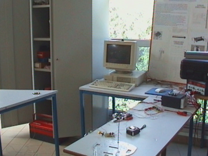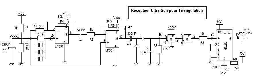 La plaque émettrice , montée sur l'objet, est constituée de six émetteurs ultrason disposés en cercle ce qui permet de repérer l'objet qu'il soit dans un sens ou dans un autre. Les récepteurs sont disposés à quelques mètres et tous deux dans le même alignement. Le PC via la broche D0 du port parallèle génère des signaux de 500µs. Après traitement par l'amplificateur intégré (ref. NE 555), le signal qui en résulte est un train d'impulsion de 40kHz émis en permanence par les émetteurs ultra -son. Ce signal est intercepté par les récepteurs. Il est amplifié, filtré puis mis en forme et enfin envoyé au PC via le port parallèle. La distance de l'objet est donc donnée en fonction de la durée entre l'émission et la réception du signal.