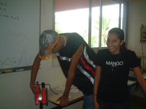 La première étape consiste à découper le châssis afin d'obtenir la forme souhaitée de la planche. Ici nous pouvons observer Mathieu, en train de poncer les bords de la planche. |