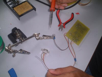 Il faut ensuite souder les différents composants sur la plaque électronique qui servira de liaison avec le port Com1 de l'ordinateur. On percera le châssis, puis l'on fixera tout d'abord la roue folle (roue de devant). On fixera ensuite les cerveaux moteur où ont été préalablement fixées les roues motrices. |