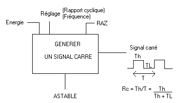 Un astable est un montage électronique qui génère un signal carré : ce signal carré est caractérisé par sa fréquence F (ou période T = 1/F) et son rapport cyclique Rc.