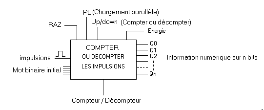 Certains circuits permettent de compter ou décompter en fonction d'un signal Up/down . Le comptage ou décomptage pourra se faire à partir d'une valeur initiale du compteur (Mot binaire initial à choisir) . Cette valeur initiale est recopiée en sortie Q0....Qn si PL est validé (PL = Chargement du compteur) . Comme pour le compteur, le décompteur est aussi un diviseur de fréquence.
