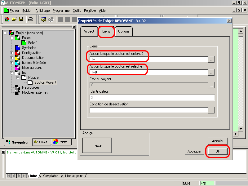 Dans l'onglet Liens, connecter le voyant à la sortie O1 de l'automate puis validez par OK :