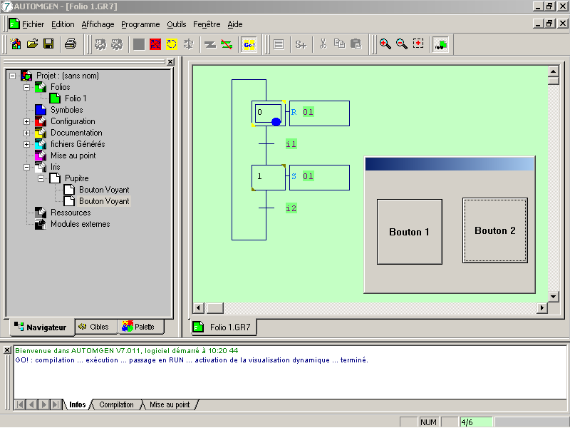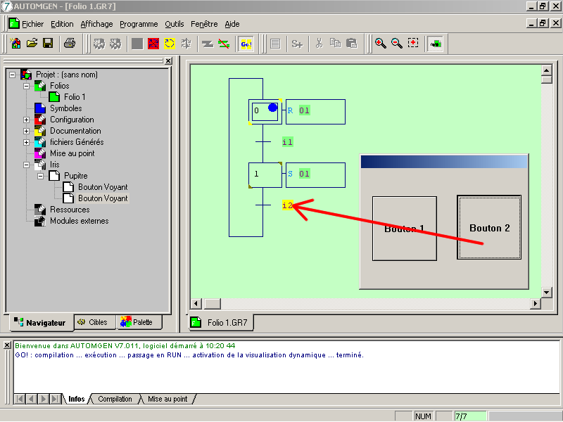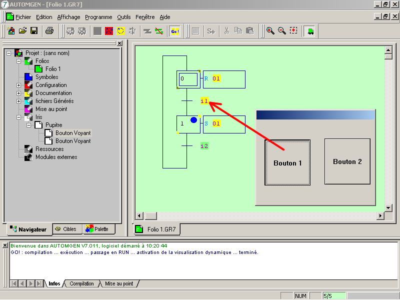 Si on appuie sur le Bouton 1, l'entrée i1 est activée et le grafcet passe alors à l'étape 1 : la conséquence est que la sortie O1 est mise à 1 :