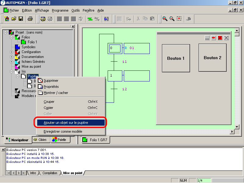 Nous allons maintenant ajouter les 2 boutons sur le pupitre. Pour ajouter un éléments au pupitre, il faut cliquer droit sur Pupitre (dans l'arborescence à gauche de l'écran) puis cliquer sur Ajouter un objet sur le pupitre :