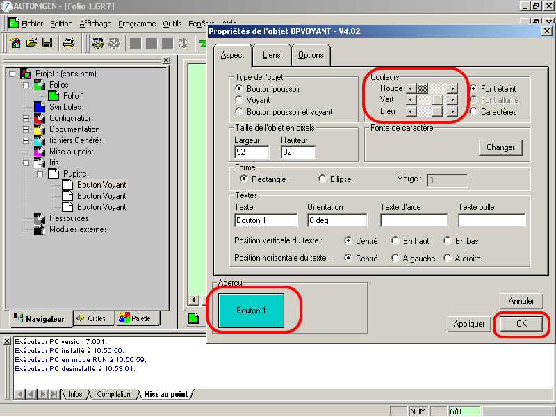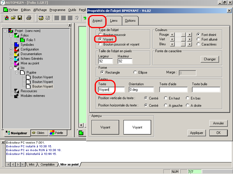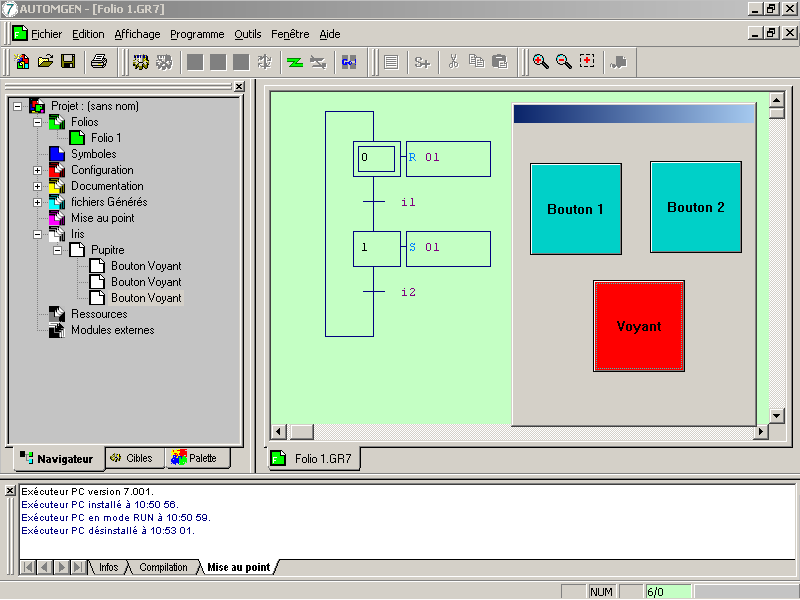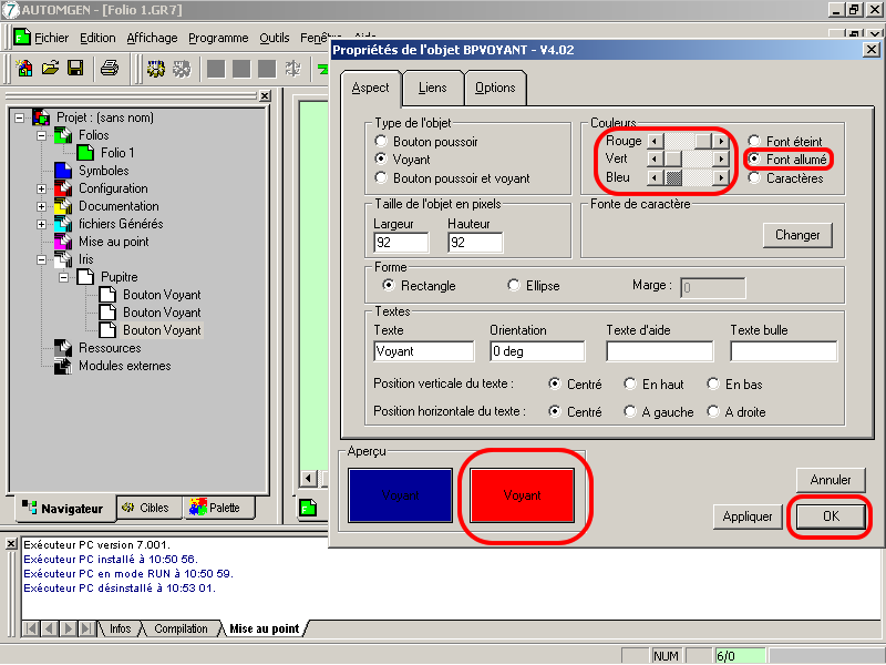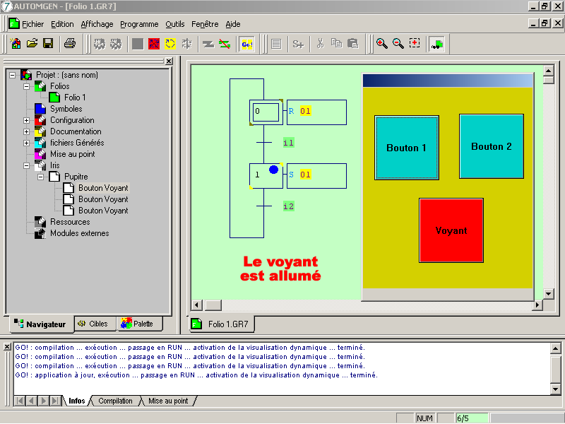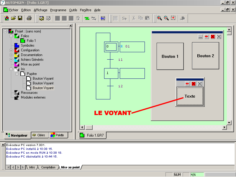 Nous venons de voir comment faire en sorte que des boutons poussoir placés sur le pupitre agissent directement sur les entrées i1 et i2 de l'automate. Voyons maintenant comment placer sur le pupitre un voyant, qui sera allumé ou éteind selon que la sortie O1 et l'automate est à 1 ou à 0.