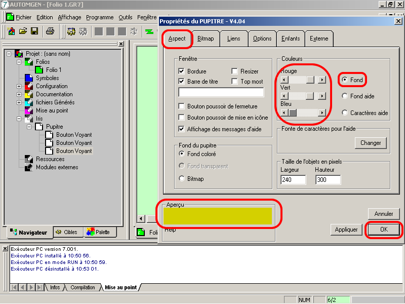 Mais avant d'ajouter le voyant nous allons agrandir le pupitre en réglant sa taille dans l'onglet Aspect de sa boite Propriétés :