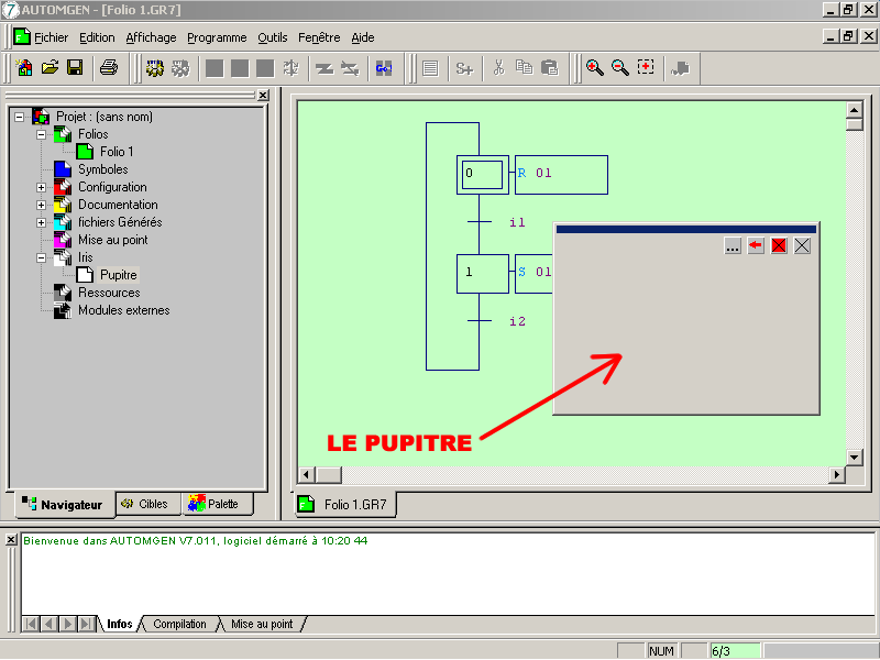 Nous allons voir dans ce document ressource comment créer sur mesure un pupitre sous Automgen, contenant des boutons et des voyants, et comment connecter les boutons aux entrées de l'automate (i0, i1, i2, i3, etc.) et les voyants aux sorties de l'automate (O0, O1, O2, O3, etc.).